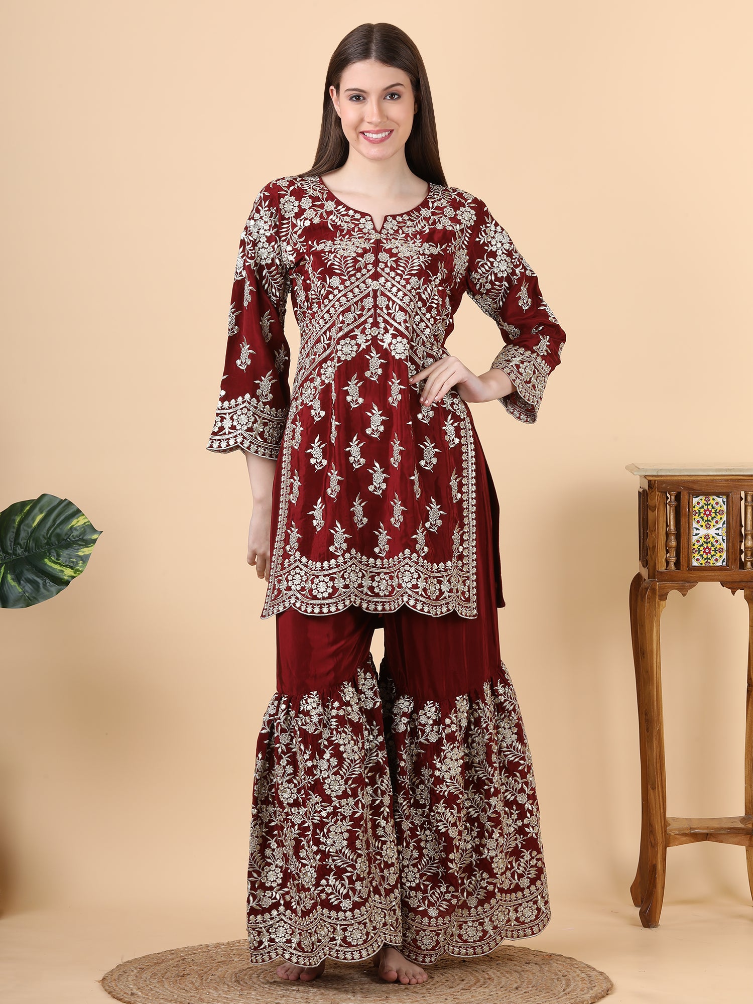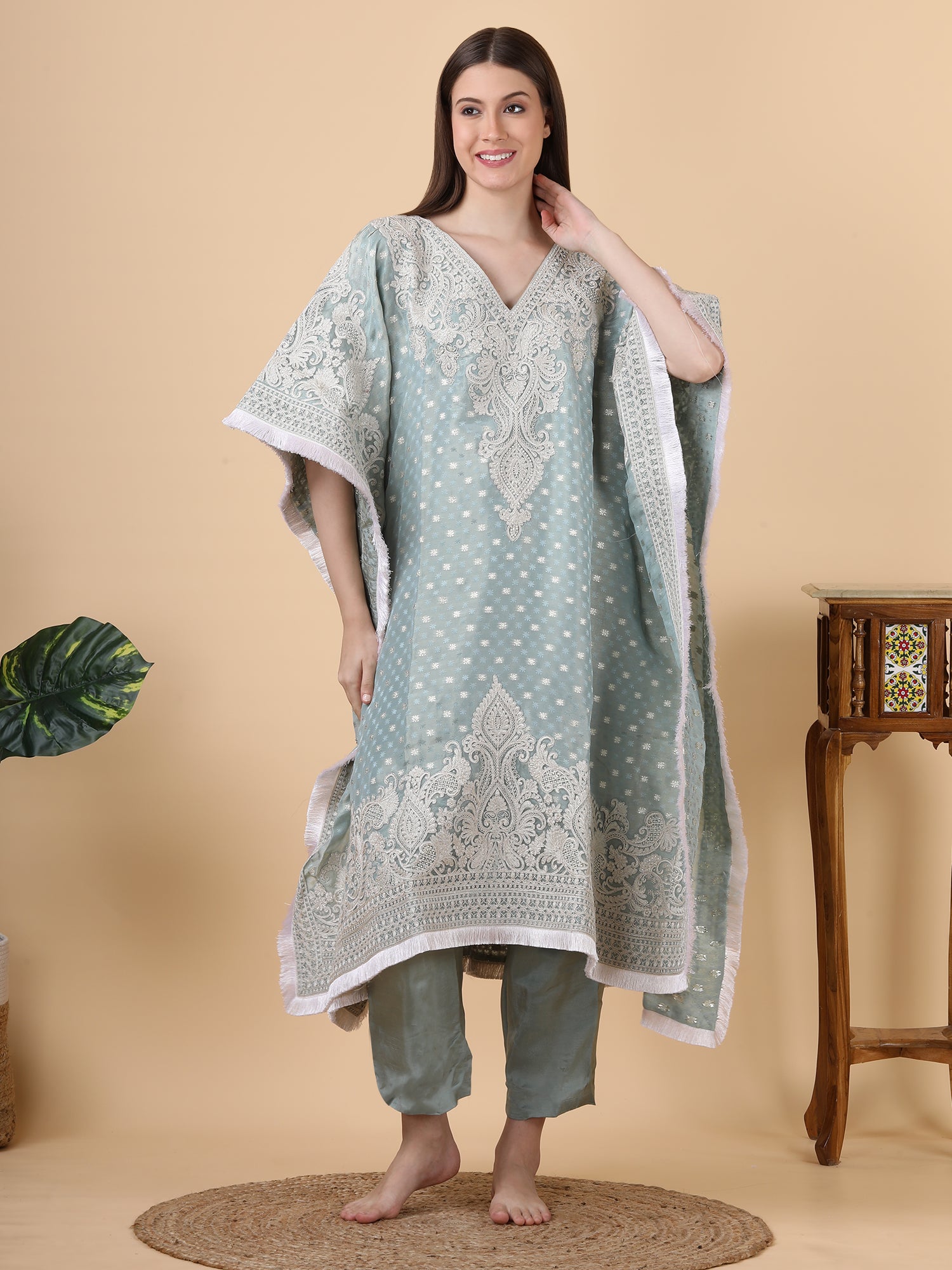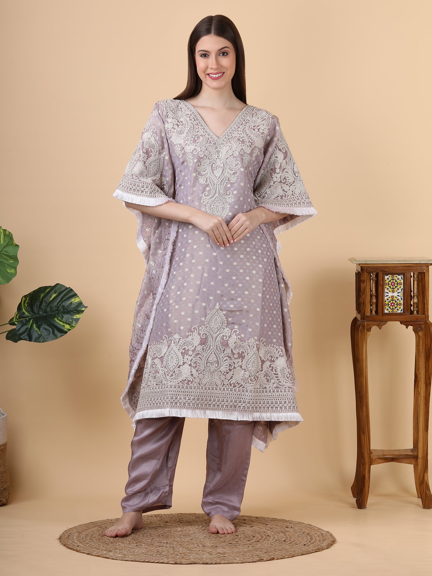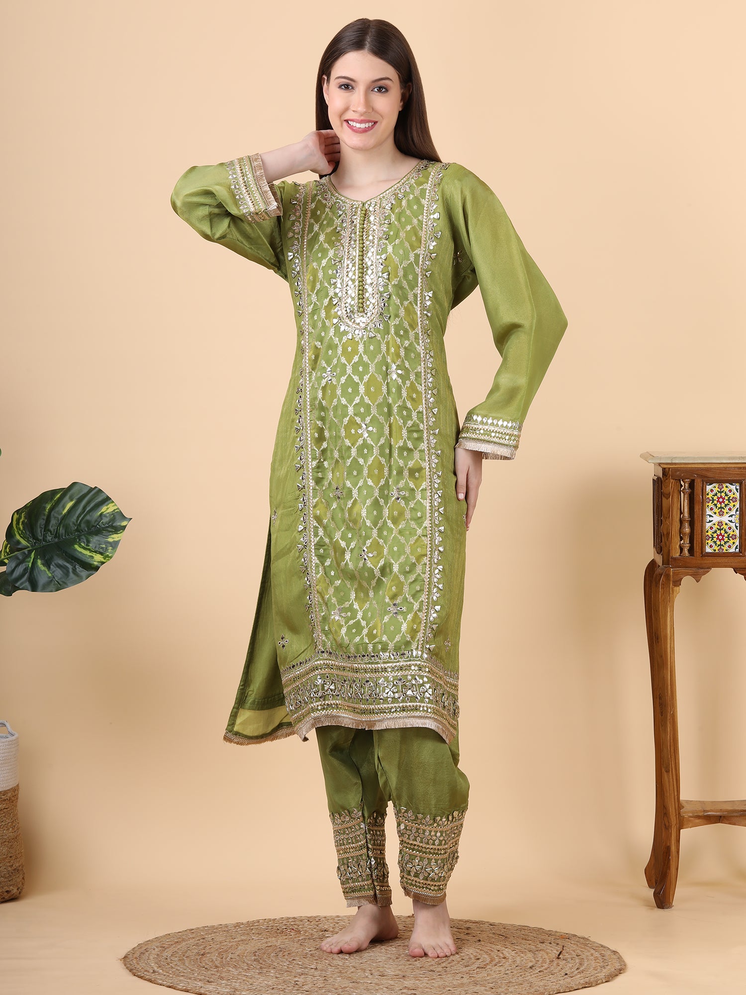 FABRIC- shimmer crepe EMBROIDERY-mirror , gota DESIGN PATTERN-kaftan WITH-pants