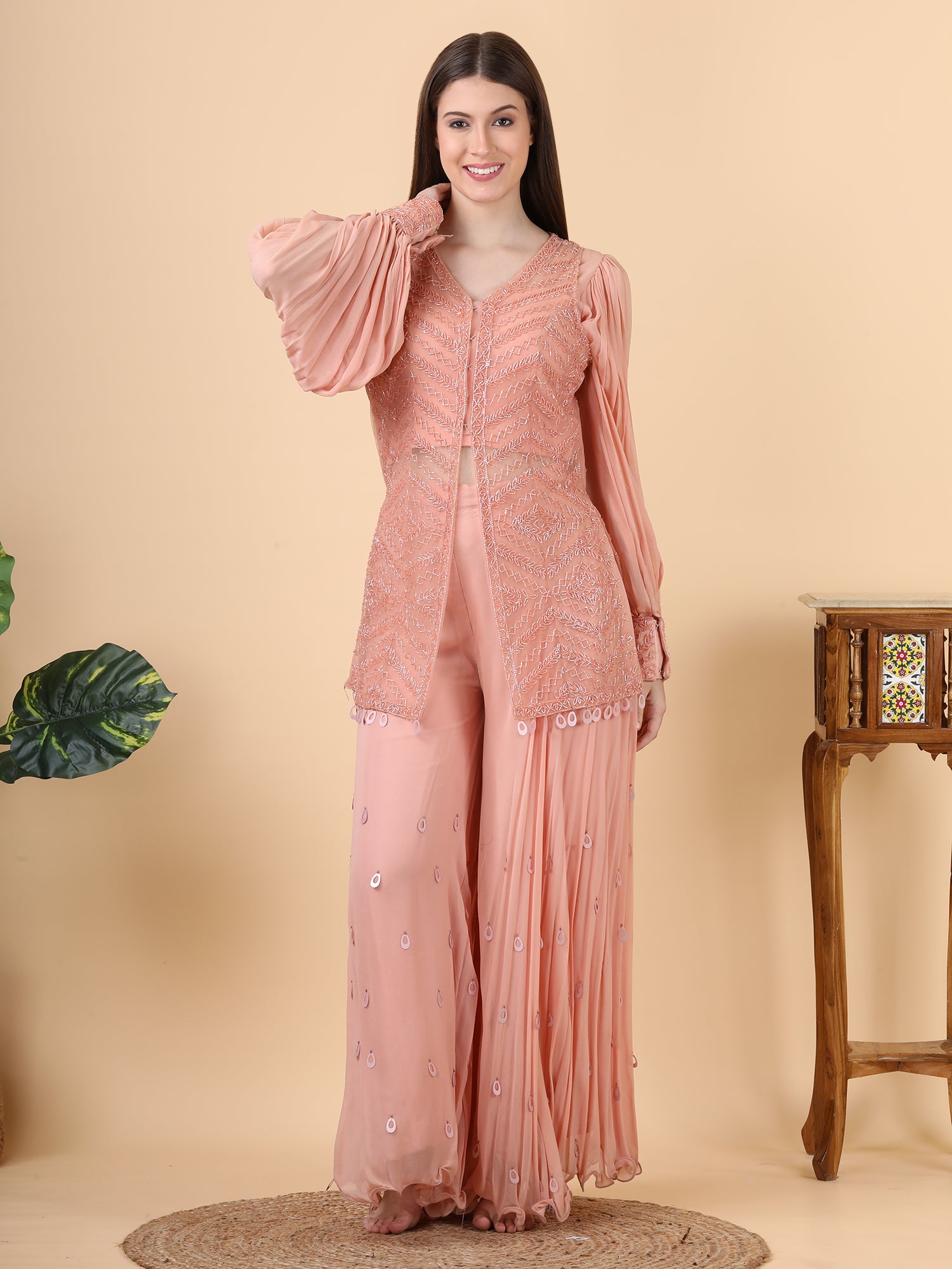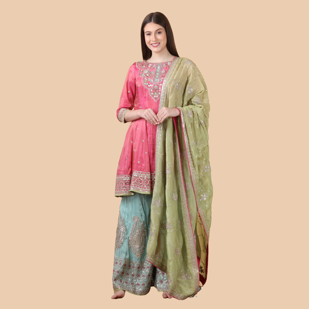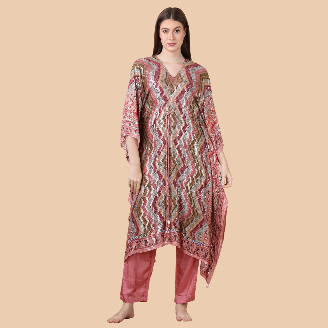 FABRIC- shimmer crepe EMBROIDERY-mirror , gota DESIGN PATTERN-kaftan WITH-pants