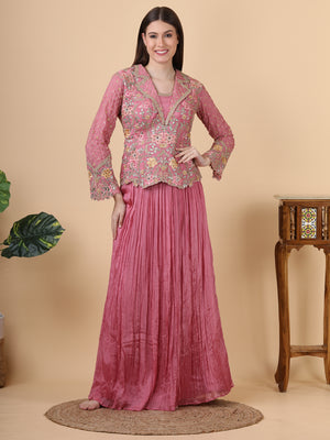 This enchanting pink crop top and and skirt set features intricate thread, zari, mirror, and sequence work that adds a dazzling array of textures and sparkle. The vibrant color and detailed embellishments create a stunning, eye-catching look, perfect for making a chic and glamorous statement at any special event.