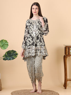 Introducing our elegant black peplum-style outfit, paired with a graceful dhoti salwar and a matching dupatta. This ensemble perfectly blends traditional charm with contemporary flair, making it a timeless addition to your wardrobe. Ideal for festive occasions and celebrations, it promises to make you stand out with its sophisticated silhouette and stunning details.