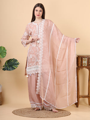 This refined pakistani suit set, featuring elegant plazo pants and a matching supatta, is adorned with intricate pearl work that adds a touch of opulence and sophistication. The delicate embellishments create a subtle yet glamorous effect, enhancing the graceful silhouette of the ensemble. Perfect for making a polished and memorable impression at any special event.