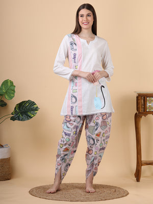 This elegant white co-ord set features a crisp, clean design complimented by printed pants for a stylish contrast. The resham embroidery adds intricate, colorful detailing that enhances the ensemble's sophistication. Perfect for a chic and polished look that effortlessly combines comfort with elegance.