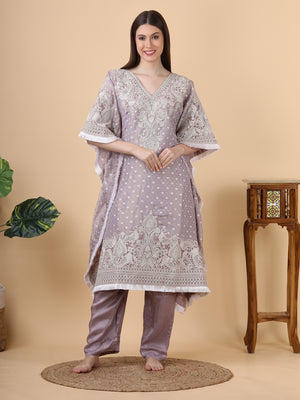 This luxurious kaftan and pant set, crafted from shimmering tissue fabric, features intricate thread, zari, and sequin embroidery that adds a touch of opulence and elegance. The delicate embellishments create a radiant, eye-catching effect, while the flowing kaftan silhouette ensures a graceful and comfortable fit. It is ideal for making a stunning impression at any special event.