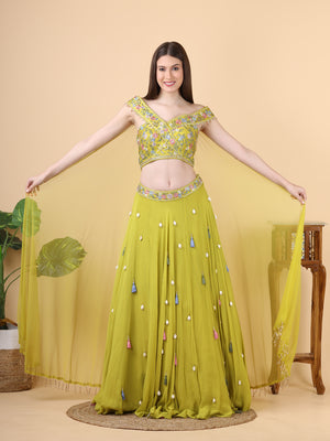 This vibrant yellow lehenga is beautifully embellished with a rich mix of thread, pearl, kodi, and shell work, creating a dazzling, multi-dimensional effect. The intricate detailing adds a touch of opulence and sophistication, making the ensemble perfect for celebrating special occasions with a splash of radiant elegance.