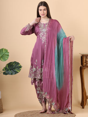 Elevate your look with our stunning purple peplum-style outfit, featuring a chic dhoti and salwar, paired with a dupatta that showcases a hint of blue. This ensemble offers a perfect blend of elegance and modern flair, ideal for special occasions and festive events. The rich purple hues with a touch of blue add a unique twist to a classic silhouette.